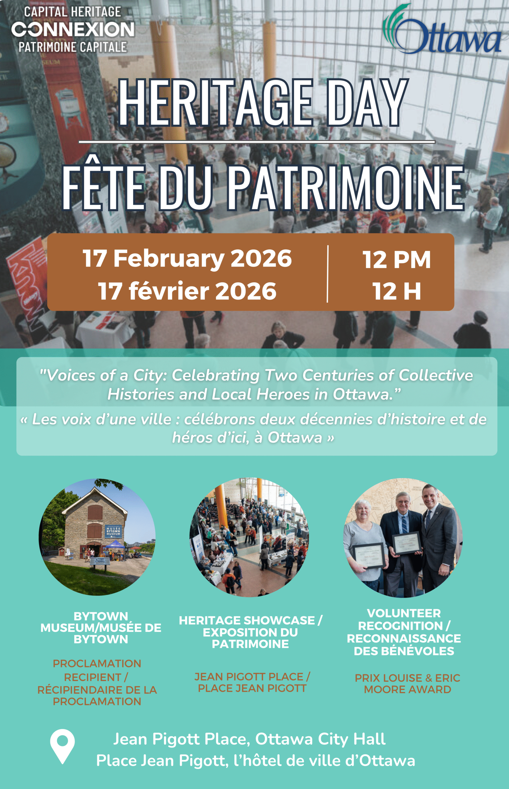 Nous sommes ravis de vous inviter à la Fête du patrimoine 2026, qui se déroulera sous le thème « Les voix d’une ville : célébrons deux siècles d’histoire et de héros d’ici, à Ottawa ». Joignez-vous à nous pour célébrer l’héritage perpétuel des personnes et des lieux qui ont été déterminants dans notre passé et qui orientent encore notre avenir.